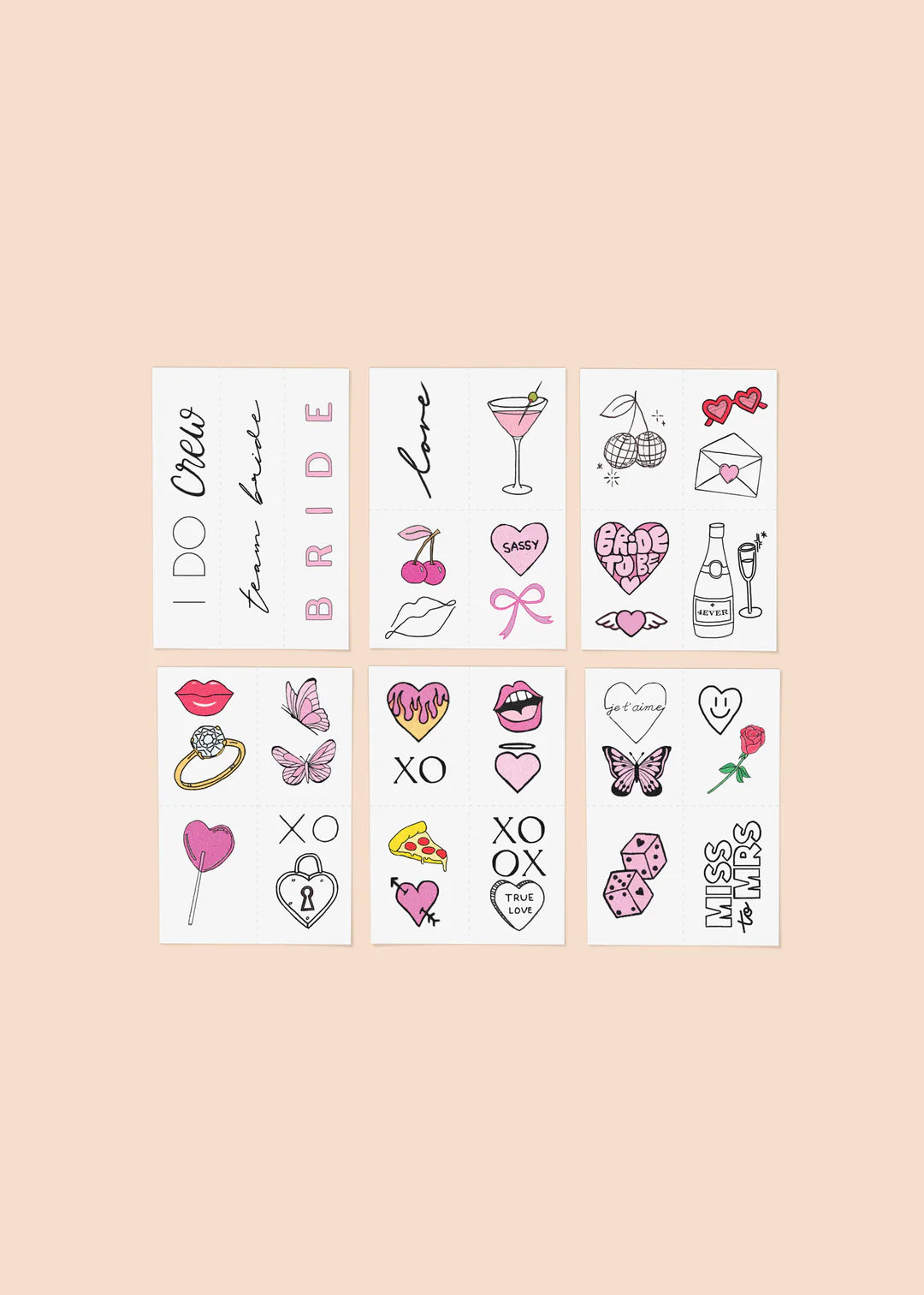 Bleikt og glæsilegt sett fyrir gæsapartý og verðandi brúður með yfir 20 handteiknuðum húðflúrum í pakkanum.